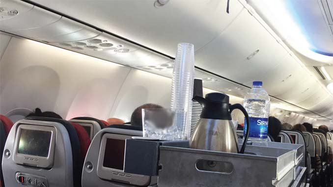 Trong suốt chuyến bay, cơ thể sẽ mất rất nhiều nước do không khí khô trong máy bay. Độ ẩm chỉ trong khoảng 10 – 20%, tương đương ở sa mạc. Các nhà nghiên cứu chỉ ra rằng trong chuyến bay 10 giờ bạn mất từ 1,6 đến 2 lít nước – khoảng 4% lượng nước trong cơ thể. Nếu không uống đủ nước, chẳng mấy chốc bạn sẽ cảm thấy mệt mỏi và đau đầu. Các hãng hàng không đều phục vụ rượu vang trong bữa ăn tuy nhiên, rượu góp phần khiến cơ thể mất nước nhiều hơn. Một ly rượu thưởng thức trên mặt đất sẽ rất khác so với một ly rượu trên máy bay. Do đó, tốt nhất là nên “nhịn rượu” cho tới khi máy bay hạ cánh.