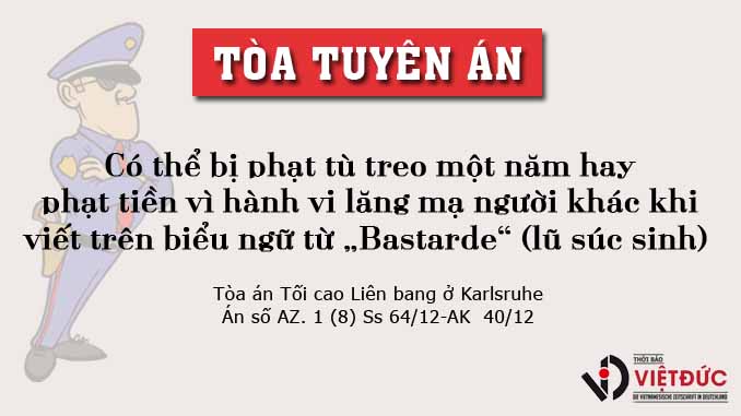 TBVĐ – Có thể bị phạt tù treo một năm hay phạt tiền vì hành vi lăng mạ người khác khi viết trên biểu ngữ từ „Bastarde“ (lũ súc sinh) để nói về cảnh sát.
