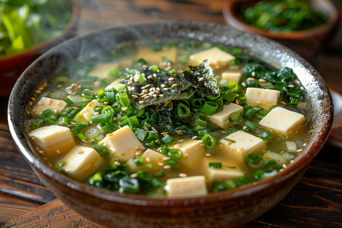 Súp miso là món ăn không thể thiếu trong bữa ăn của người Nhật. Là một sản phẩm lên men từ đậu nành, miso chứa hàng tỷ vi khuẩn có lợi giúp giảm viêm nhiễm đường ruột và tăng cường hệ miễn dịch. Theo một nghiên cứu từ Nhật Bản, những người thường xuyên ăn các sản phẩm từ đậu nành lên men có tuổi thọ cao hơn và giảm nguy cơ tử vong sớm. (© T °B#V :Đ. )