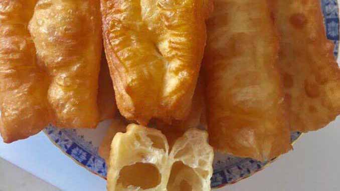 – Cho 1 lit dầu vào chảo hoặc nồi. Chờ đến khi dầu thật nóng thì dùng hai tay kéo phần bột dài ra gấp hai lần và thả vào chảo.