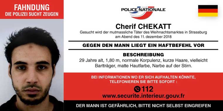 Trước đó, khoảng 700 cảnh sát đã được huy động để truy tìm dấu vết của Chérif Chekatt kể từ sau khi tên này xả súng tại khu chợ giáng sinh nổi tiếng nhất nước Pháp. Cũng kể từ sau vụ xả súng, cảnh sát Pháp đã tổ chức chiến dịch kiểm tra đặc biệt tại khu vực này nhằm loại bỏ nghi ngại kẻ khủng bố có thể vẫn đang lẩn trốn tại đây.