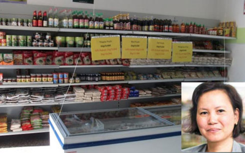 Trong cửa hàng số 45, một phụ nữ trẻ đang soạn rau, đó là chị Đỗ Thị Du. Trên giá toàn những đồ ăn châu Á, miến, bánh phở, bún các loại, nước mắm trong can, hải sản đông lạnh có vẩy và không vẩy, các bao gạo, nấm khô, mộc nhĩ và nấm tươi trông như kim khâu vậy. Gừng và chuối luộc thì tôi còn biết, nhưng còn nhiều loại rau thơm gia vị không biết là gì. Anh Đoàn phải dịch giúp vì chị Du biết ít tiếng Đức.