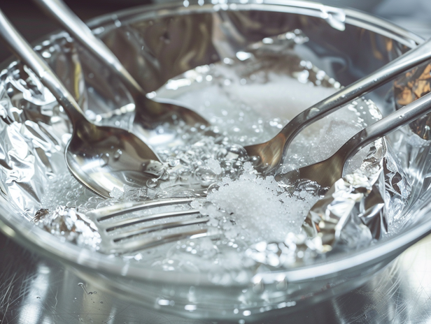 Để thực hiện, bạn cần một cái bát làm bằng thủy tinh hoặc gốm, muối và nước sôi. Đầu tiên, lót giấy bạc vào bát, đặt dụng cụ cần làm sạch lên trên, rắc muối và đổ nước sôi vào. Sau vài phút, các vết xỉn màu sẽ biến mất, để lại bề mặt sáng bóng. Lưu ý là quá trình này tạo ra khí hydro sulfide, có mùi trứng thối, nên cần thực hiện ở nơi thoáng khí.