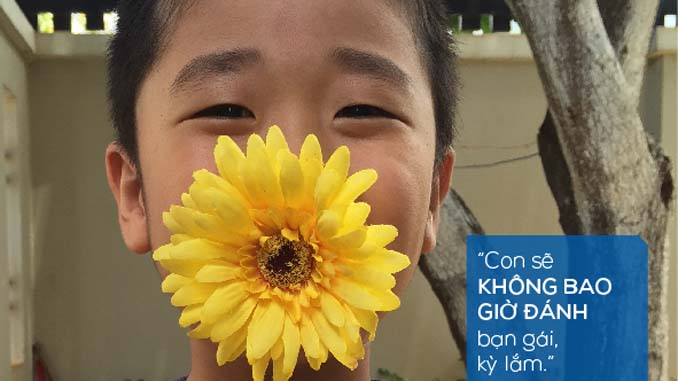 Cậu bé Vũ Trường Sơn, 6 tuổi, nhất định không bao giờ đánh bạn gái vì “kỳ lắm” – Ảnh trong chiến dịch