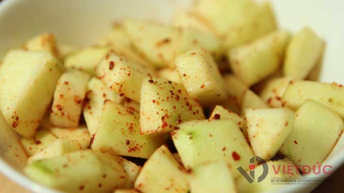 Táo gọt vỏ, cắt khúc nhỏ, ngâm vào nước lạnh có pha chút muối để táo tiết ra bớt nhựa và không bị thâm đen.