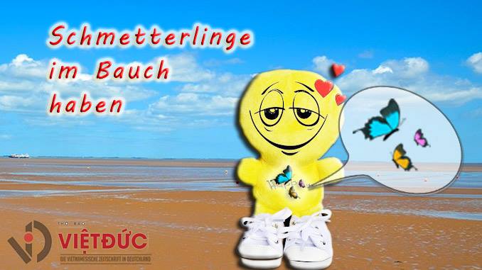 Nghĩa tiếng Đức: verliebt sein, glücklich, aufgeregt, sich leicht fühlen; flatterige Gefühle im Bauch haben