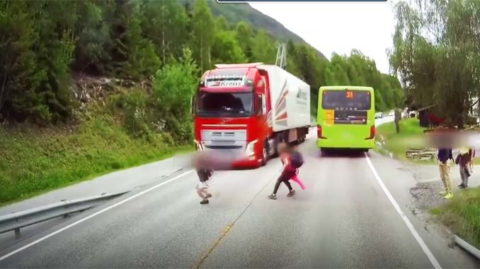 Sau khi xuống khỏi chiếc xe bus trường học, đám trẻ di chuyển từ phía sau chiếc xe bus băng qua đường, do khuất tầm nhìn nên xe tải từ phía ngược chiều đã không phát hiện ra có người băng qua đường. Chỉ đến khi tới gần với khoảng cách hơn 10m, tài xế xe tải mới hoảng hốt xử lý. Nhờ công nghệ tự thắng mới được lắp đặt ở một số hệ thống xe, chiếc xe tải của hãng Volvo đã cứu sống đứa trẻ trong tích tắc.