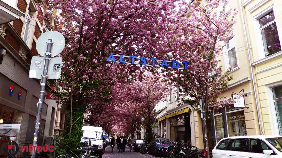 Đường phố ở trung tâm thành phố Bonn hiện được phủ đầy hoa anh đào, tạo nên một khung cảnh rực rỡ, tuyệt đẹp. Các con đường nhỏ trong khu phố cổ cũng bị che phủ bởi hàng loạt cánh hoa màu hồng.