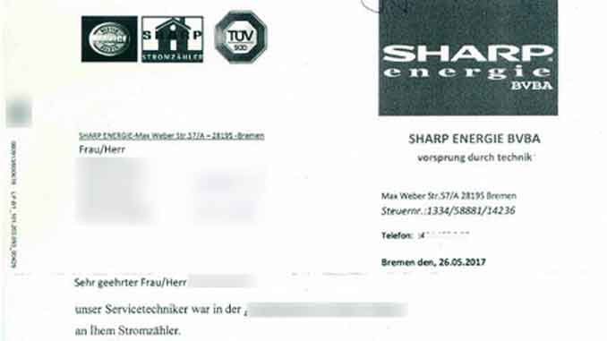 Theo Hiệp hội bảo vệ người tiêu dùng tại Nordrhein-Westfalen, hóa đơn đòi tiền đứng tên công ty “Sharp Energie BVBA” ở Bremen. Người nhận thư phải đóng 79,49 Euro tiền dịch vụ bảo trì đồng hồ điện cho nhân viên kĩ thuật. Khoản tiền được yêu cầu chuyển đến một tài khoản ở Bỉ.