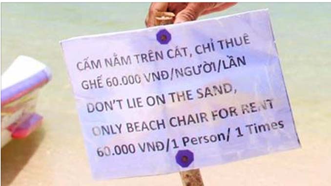 Sáng 3-9, trên Facebook một du khách đăng ảnh chụp tấm bảng cấm với nội dung “Cấm nằm trên cát, chỉ thuê ghế 60.000 VND/người/lần” kèm tiếng Anh. Nhiều người không biết thực hư thế nào.