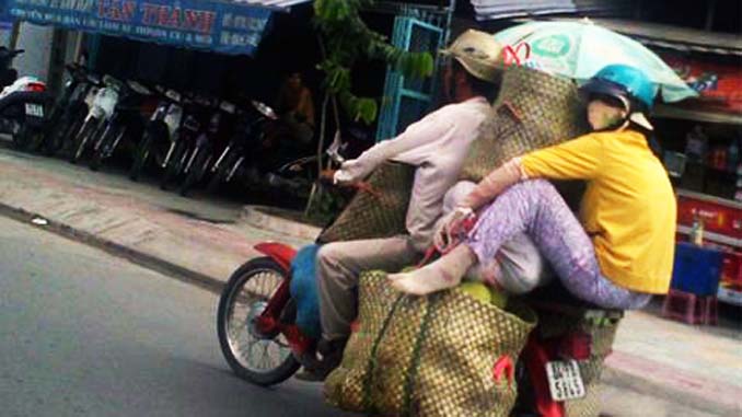 Xe máy tại Việt Nam là phương tiện giao thông số một, giống như ô tô tại Đức. Vì vậy mọi người dùng nó để chuyên chở mọi thứ khiến ta phải ngạc nhiên bội phục, từ dăm thành viên gia đình tới rau quả, đồ ăn, thậm chí gia súc, bò lợn vừa giết mổ.