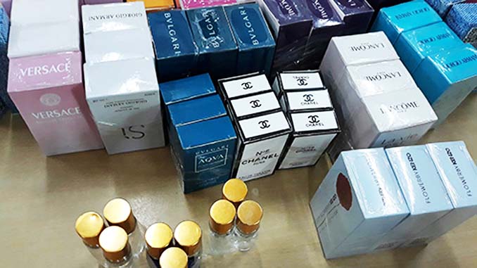 Gần 10.000 chai dầu thơm gắn nhãn hàng nổi tiếng thế giới như Chanel, Versace, Tommy, Gucci…; hàng loạt bao bì, nhãn mác, can đựng cồn bị thu giữ.