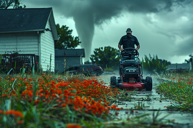 Người Đàn Ông Dũng Cảm Vẫn Tiếp Tục Cắt Cỏ Bất Chấp Cơn Lốc Xoáy