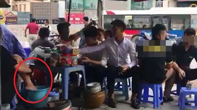 Ngày 12/7, người này dùng điện thoại ghi lại cảnh một cô gái cho chân vào xô nước tại quán trà đá trên đường Cầu Giấy. Sau đó, cô này múc nước ra pha trà cho khách. Những hình ảnh này phát tán trên mạng đã khiến nhiều người bất bình.
