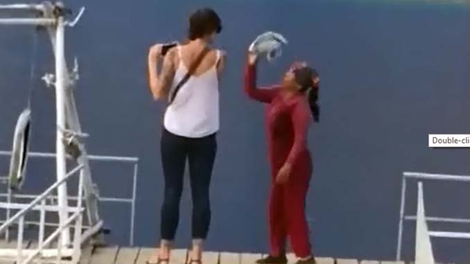 Người phụ nữ ra cầm khăn, chửi bới thiếu văn hóa và xua đuổi hai vị khách nước ngoài khi họ có ý định ngắm và chụp ảnh Tuyệt tình cốc ở xã An Sơn, huyện Thủy Nguyên, Hải Phòng.