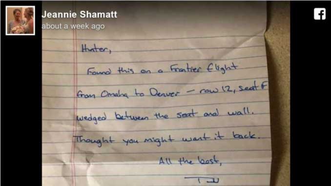 Lá thư ghi rằng: “Tìm thấy chiếc vì này trên chuyến bay Frontier từ Omaha đi Denver, hàng số 12, ghế F, kẹt giữa ghế và thân máy bay. Tôi nghĩ anh muốn có lại cái ví này. Tái bút: Tôi bỏ vào thêm tiền cho đủ 100 đô la, để anh có thể ăn mừng việc nhận lại cái ví. Vui vẻ nhé!!!”.