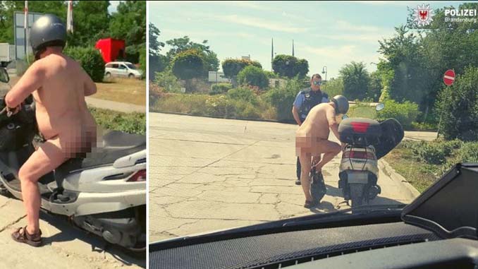 Trang tin Local phiên bản của Đức (local.de) chia sẻ hình ảnh một người đàn ông quyết định “trút bỏ xiêm y” cho đỡ nóng khi đi xe máy do cảnh sát bang Brandenburg ở đông bắc nước Đức đưa lên tài khoản Twitter của họ.