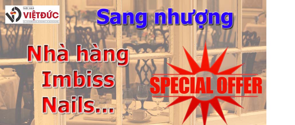 Vì lý do cá nhân cần sang nhượng gấp quán ăn AsiaBistro/Bier trong Edekacenter tại Neukirchen (độc quyền bia và nhà hàng châu Á). Quán hiện bán chủ yếu bia và đồ uống, kèm đồ ăn châu Á. Doanh thu ổn định trên 500 Euro/ngày thường. Cuối tuần đông khách. Không phải trả tiền nhà và phụ phí vì đã cho thuê 2 máy tít tít bù vào. Rất thích hợp cho kinh doanh hộ gia đình. Có thể phát triển mở rộng. Giá sang nhượng 80.000 Euro. Ai có nhu cầu xin liên hệ Tel.: 0172-1011071.